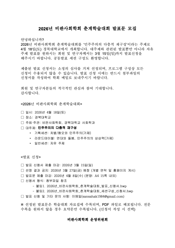 2026년 비판사회학회 춘계학술대회 발표원고 모집