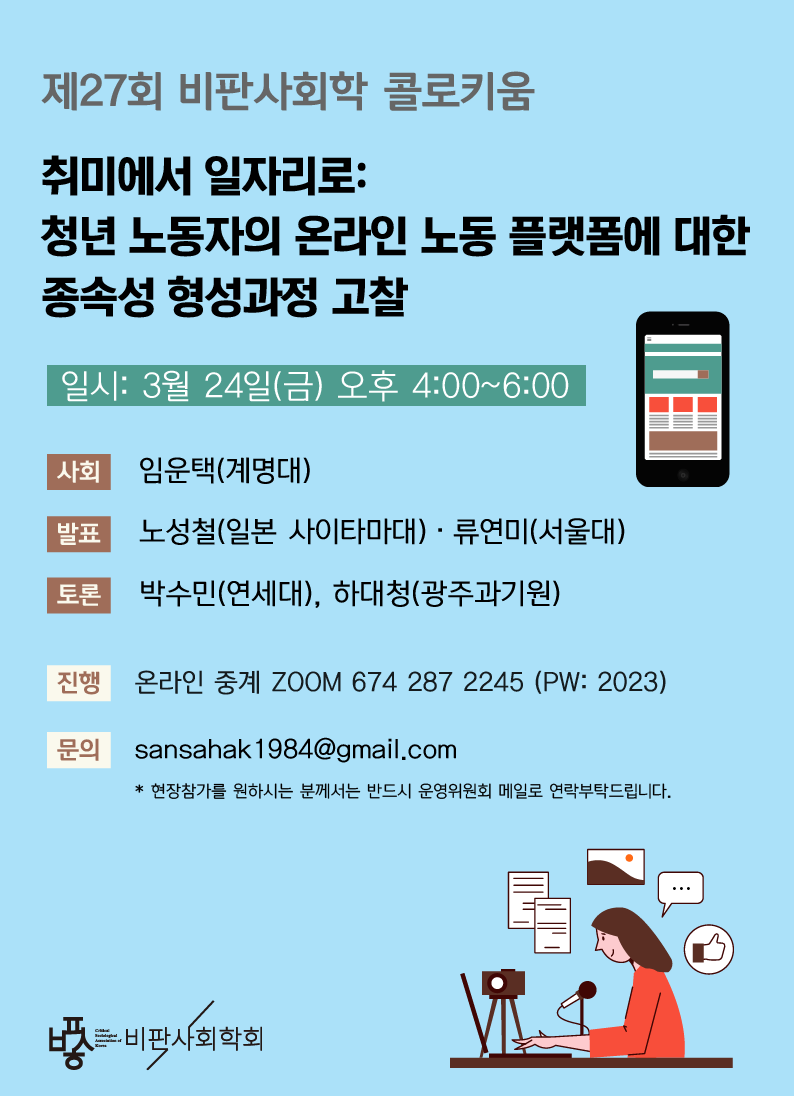 [비판사회학회] 제27회 비판사회학 콜로키움 <취미에서 일자리로: 청년 노동자의 온라인 노동 플랫폼에 대한 종속성 형성과정 고찰> (3월 24일)