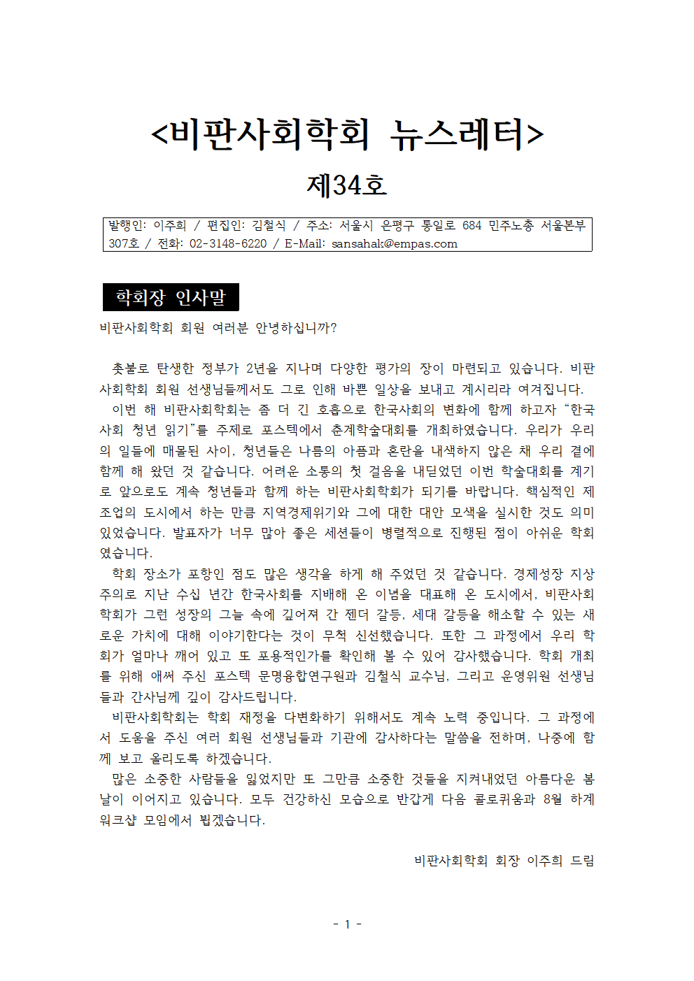 비판사회학회 뉴스레터 34호입니다.